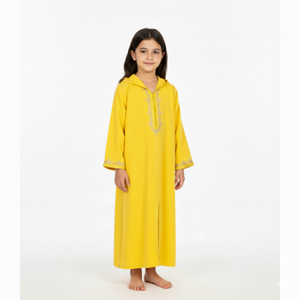 جلابة أنيقة للفتيات من قماش الكريب الحريري، مزينة بالعقاد والصفيفة الحريرية بالإضافة إلى تطريز معلم اختياري بأربعة خيوط، مما يضفي لمسة حرفية وراقية.