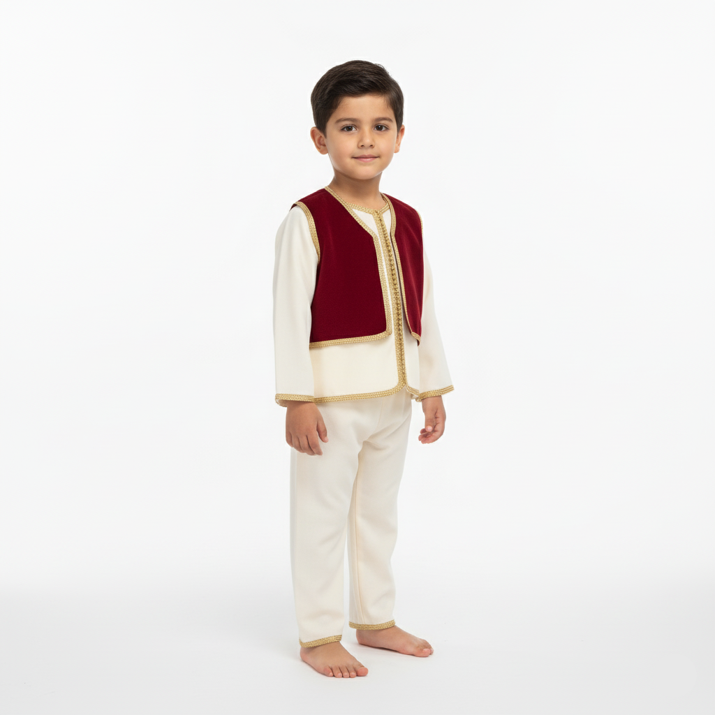 Elégant Jabador en trois pièces spécialement conçu pour les garçons. Ce superbe ensemble comprend un haut et un pantalon confectionnés avec un tissu en Mlifa de haute qualité, tandis que le gilet est réalisé en délicate mousseline pour un confort optimal.