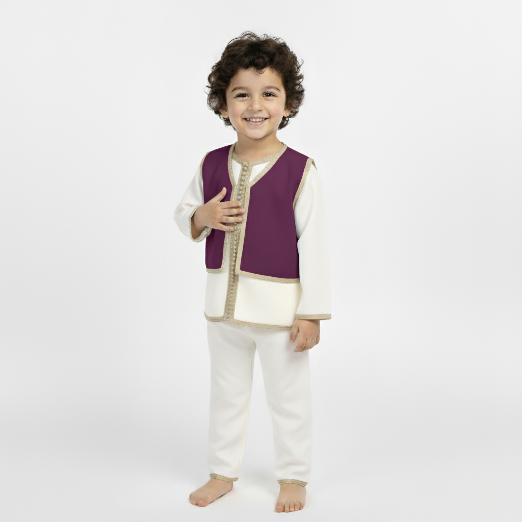 Elégant Jabador en trois pièces spécialement conçu pour les garçons. Ce superbe ensemble comprend un haut et un pantalon confectionnés avec un tissu en Mlifa de haute qualité, tandis que le gilet est réalisé en délicate mousseline pour un confort optimal.