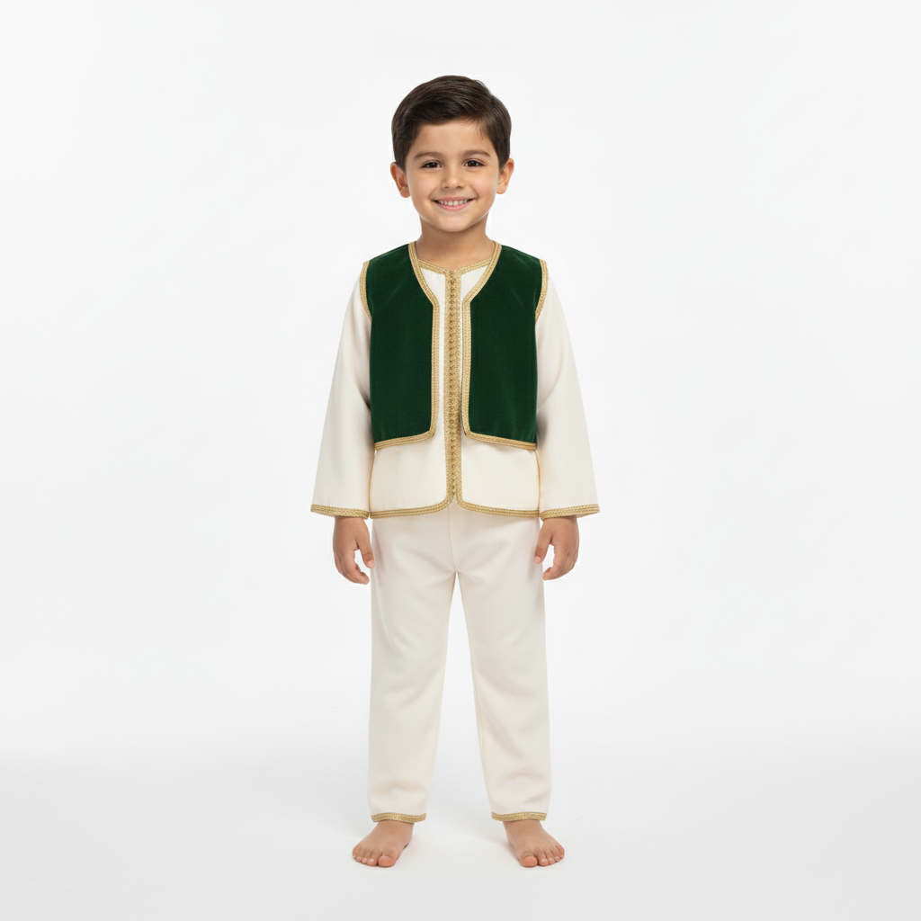 Elégant Jabador en trois pièces spécialement conçu pour les garçons. Ce superbe ensemble comprend un haut et un pantalon confectionnés avec un tissu en Mlifa de haute qualité, tandis que le gilet est réalisé en délicate mousseline pour un confort optimal.